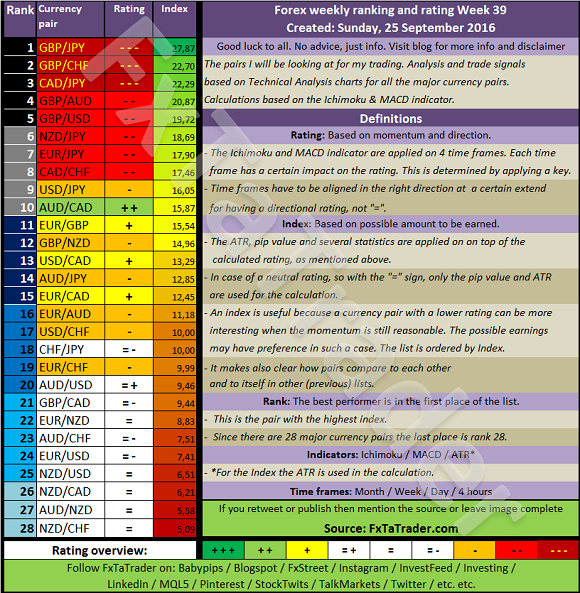 Analysis based on TA charts for all the major currency pairs. Good luck to all. No advice, just info. Every week the Forex ranking rating list will be prepared in the weekend. All the relevant Time Frames will be analyzed and the ATR and Pip value will be set.