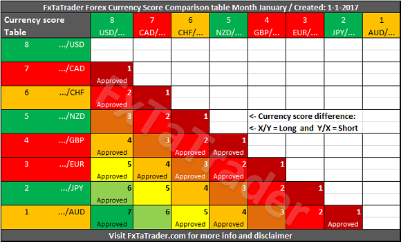 The Forex Currency Comparison Table compares each currency with its counterpart based on the Currency Score. For more information about the currency Score of this month you can read the article "Forex Ranking, Rating and Score" which is published every month together with this article.