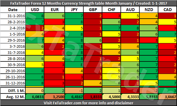 The 12 Months Currency Strength and the 12 Months Average are provided here below. This data and the "12 months Currency Classification" are considered for deciding on the preferred range. Because it is not ideal nor desired to change the range for a currency every single month, we perform several checks to avoid this.