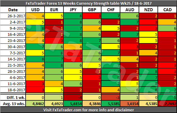The 13 Weeks Currency Strength and the 13 Weeks Average are provided here below. This data and the "13 weeks Currency Classification" are considered for deciding on the preferred range. Because it is not ideal nor desired to change the range for a currency every single week, we perform several checks to avoid this.