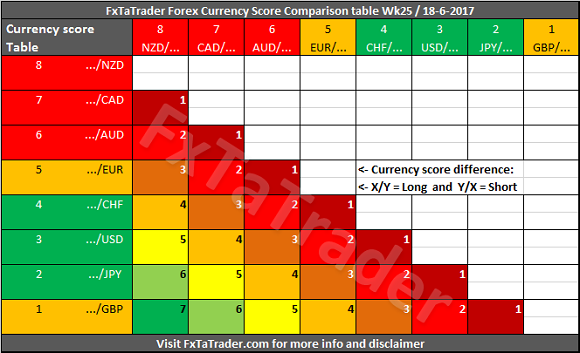 The Forex Currency Comparison Table compares each currency with its counterpart based on the Currency Score. For more information about the currency Score of this week, you can read the article "Forex Ranking, Rating and Score" which is published every week together with this article.
