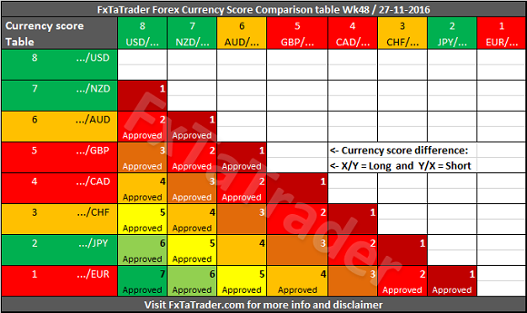 - First of all only better classified currencies in combination with weaker classified currencies are "Approved" when there is a Currency Score difference of at least 1 in the current week.