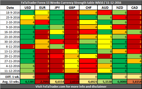 The 13 Weeks Currency Strength and the 13 Weeks Average are provided here below. This data and the "13 weeks Currency Classification" are considered for deciding on the preferred range. Because it is not ideal nor desired to change the range for a currency every single week, we perform several checks to avoid this.