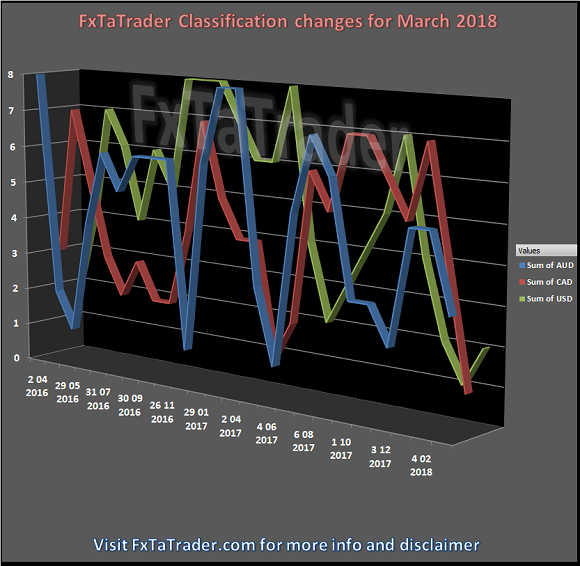 This month we take a look at the Classification changes. As can be seen, the 3 currencies are at the lower side of the range with Scores of 1,2 and 3. The AUD and CAD changed from Strong to Neutral while the USD changed from Neutral to Weak.