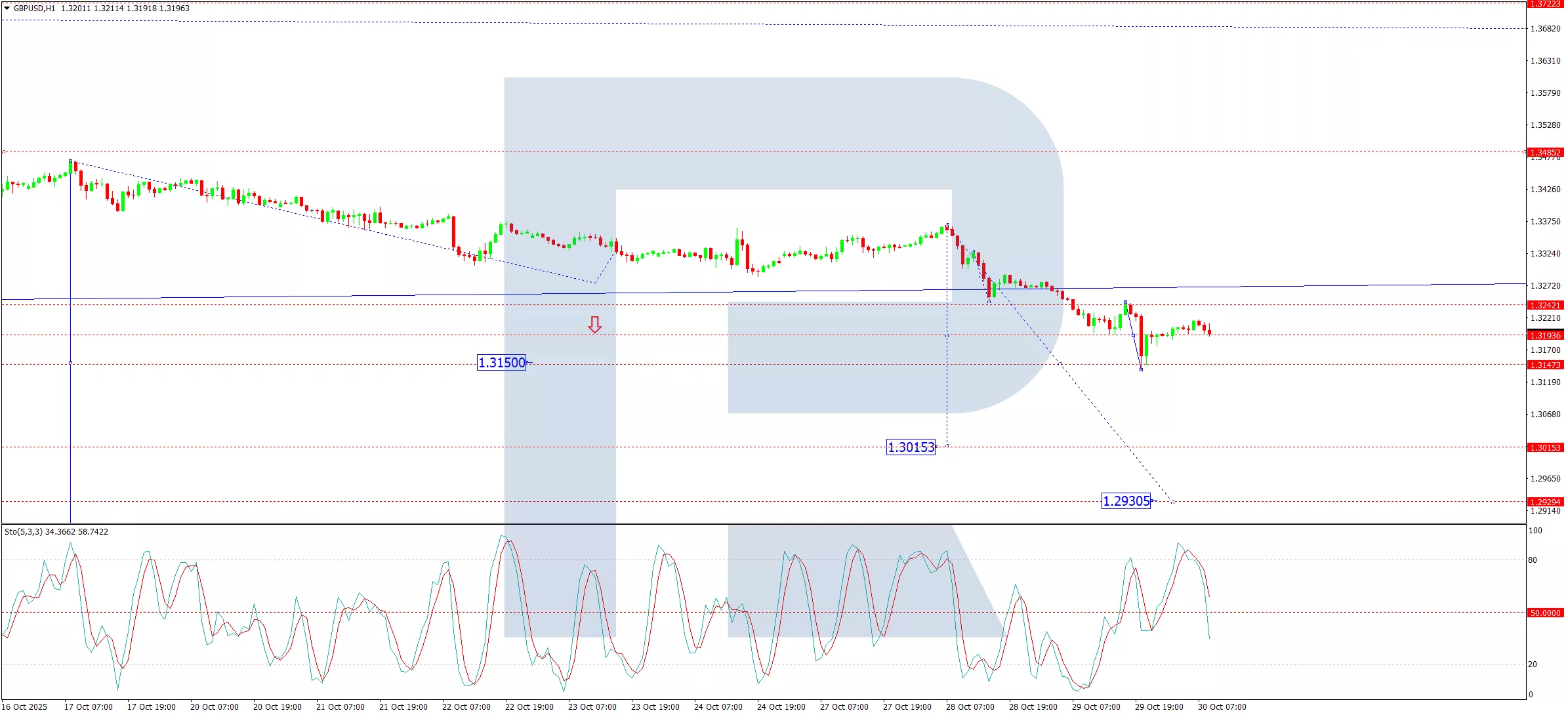 On the H1 chart, the pair has completed a downward impulse to 1.3193 and formed a consolidation range, which has since expanded down to 1.3139. We now foresee a technical retest of 1.3217 from below, after which a further decline towards 1.3111 is expected. A decisive break below this support level would open the path for a move down to at least 1.3015. The Stochastic oscillator supports this outlook, with its signal line having turned down from below the 80 level and heading towards 20, reflecting building bearish momentum in the short term.