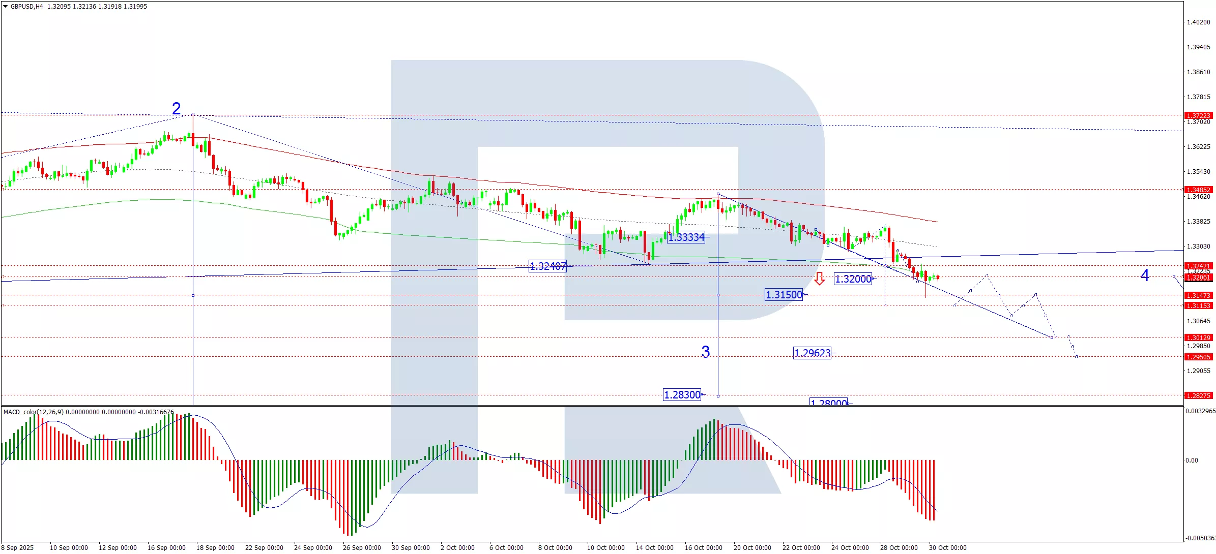 On the H4 chart, GBP/USD is developing a bearish wave structure targeting 1.3111. We anticipate the pair reaching this level before forming a consolidation range around it. Critically, this move is considered the third and typically powerful wave within the broader downtrend, with the 1.3111 target representing only its initial phase. Following consolidation, we expect a downward breakout and a continuation of the sell-off to at least 1.2830. This bearish scenario is confirmed by the MACD indicator, whose signal line is below zero and pointing decisively downward, indicating sustained selling momentum.