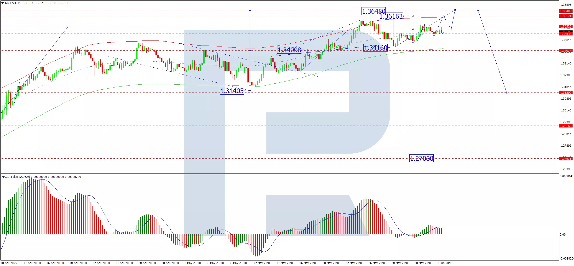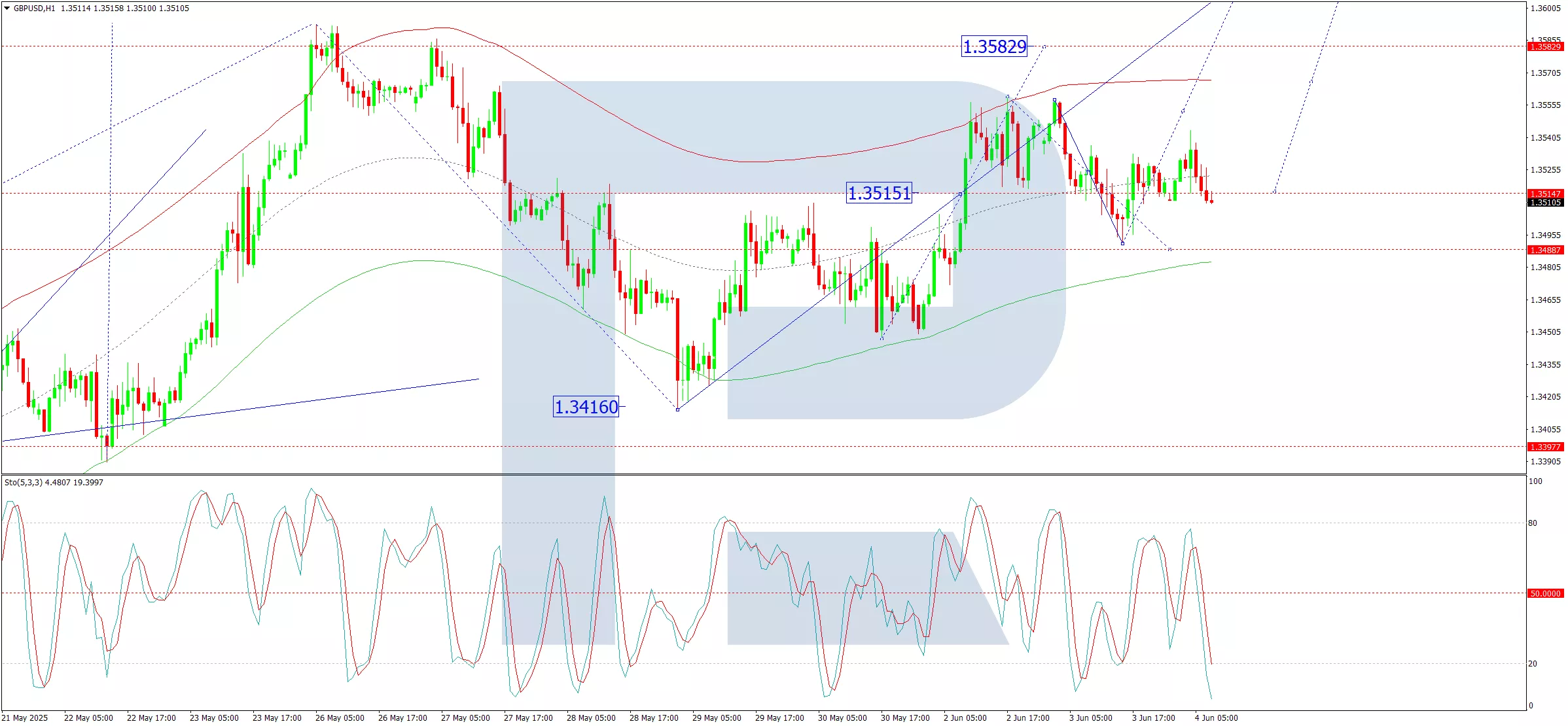 The GBP/USD pair remains steady around 1.3515, maintaining its strength after reaching a three-year high on 26 May. The British pound has shown greater stability than other major currencies amid rising geopolitical and economic pressures.