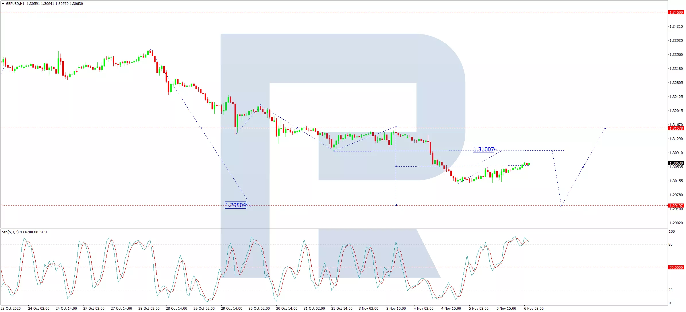On the H1 chart, the pair similarly broke down from a range around 1.3157, reaching the 1.3010 target. A corrective retracement to test 1.3100 from below is now expected. Once this correction is complete, the downtrend is likely to extend towards at least 1.2950. The Stochastic oscillator aligns with this view. Its signal line is in overbought territory above 80 and appears poised to turn down towards 20, indicating that any near-term strength is likely corrective before selling pressure reasserts itself.