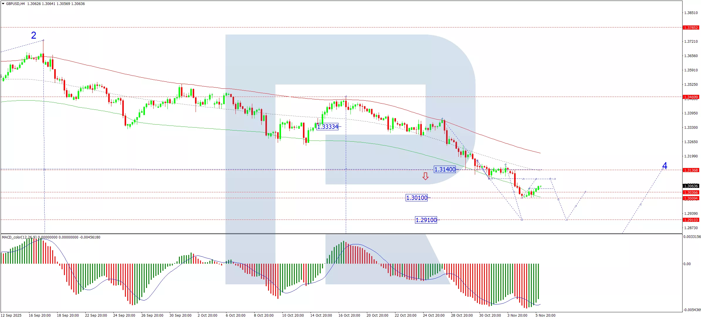 On the H4 chart, GBP/USD broke downwards from a consolidation range around 1.3140, completing a bearish wave to 1.3010. We now anticipate a technical correction towards 1.3090. Following this pullback, the primary downtrend is expected to resume, with the next key targets at 1.2910 and, ultimately, 1.2811. The MACD indicator supports this bearish outlook. While its signal line is at deeply oversold levels and has diverged from its histogram, suggesting the potential for a short-term corrective rise, the overall structure remains negative.