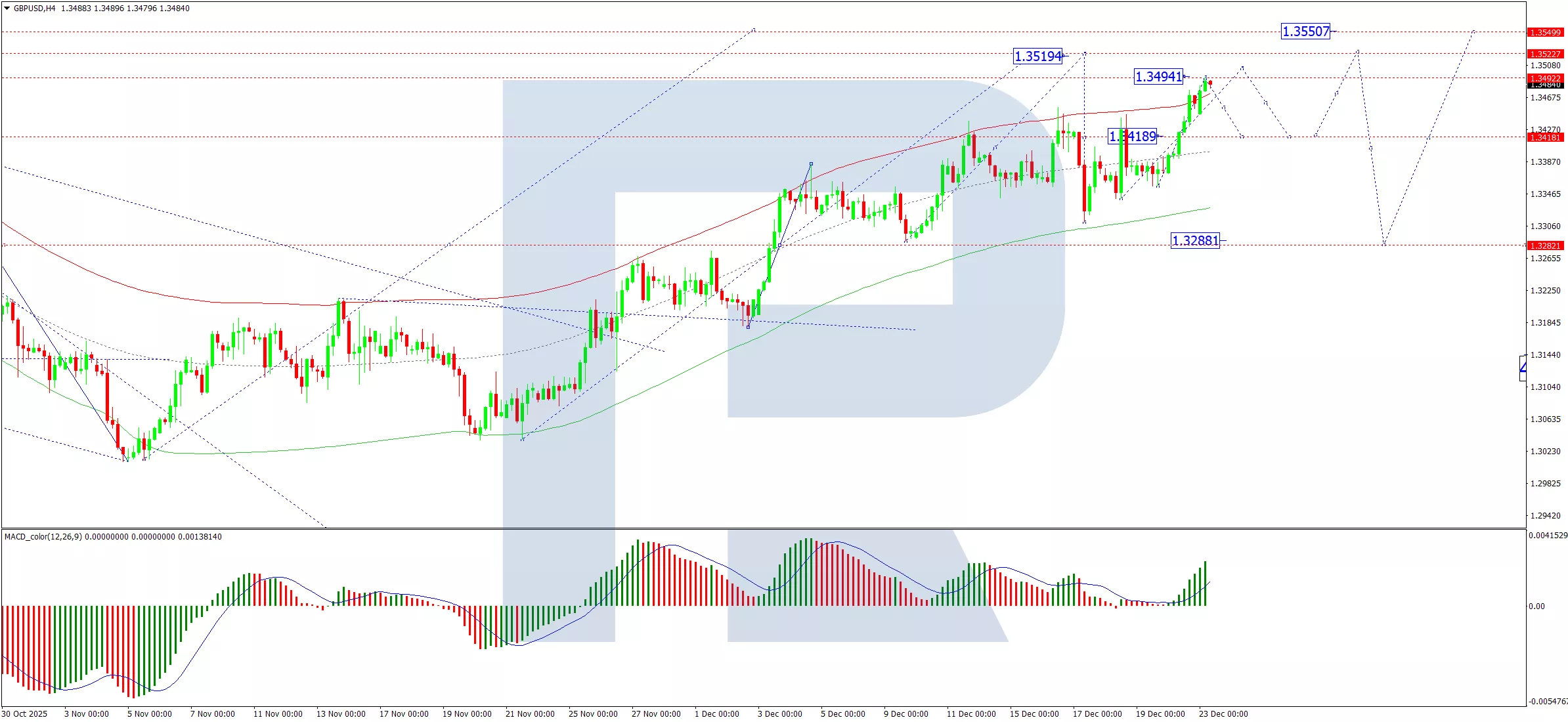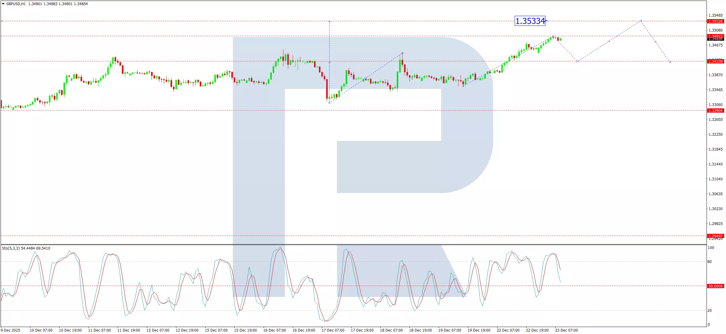 On the H1 chart, price action formed a tight consolidation around 1.3424 before breaking higher and advancing to 1.3492 (a local target). We now expect a corrective decline to retest the 1.3424 level from above. Once this correction concludes, the focus will shift to the potential for a subsequent growth wave toward 1.3533.
