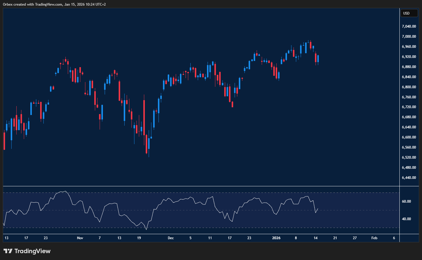 The S&P holds on to another dip as stocks look to begin the year on a positive note. As the index reached its previous swing low at 6880, profit-taking and fresh selling could put the price under pressure. Sellers will look for a break below 6800 to trigger a liquidation of short-term positions, confirming the divergence play. A bullish breakout, though, would open the door to testing 7000 as the market begins to warm up.