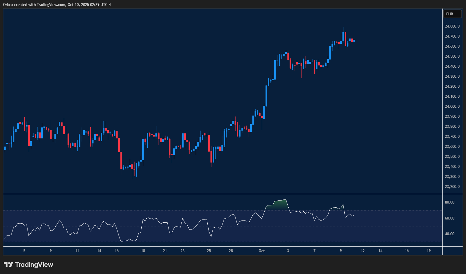 The Dax lost some ground after hitting a fresh high above 24700. A break below 24500 would lead the bulls to take some chips off the table, and this could be a pivotal point for the price action in the coming week. The medium-term trend would remain bullish if the quote is above, heading towards the next target at 25000. 24500 is a fresh support with 24225 as a second layer of defence.
