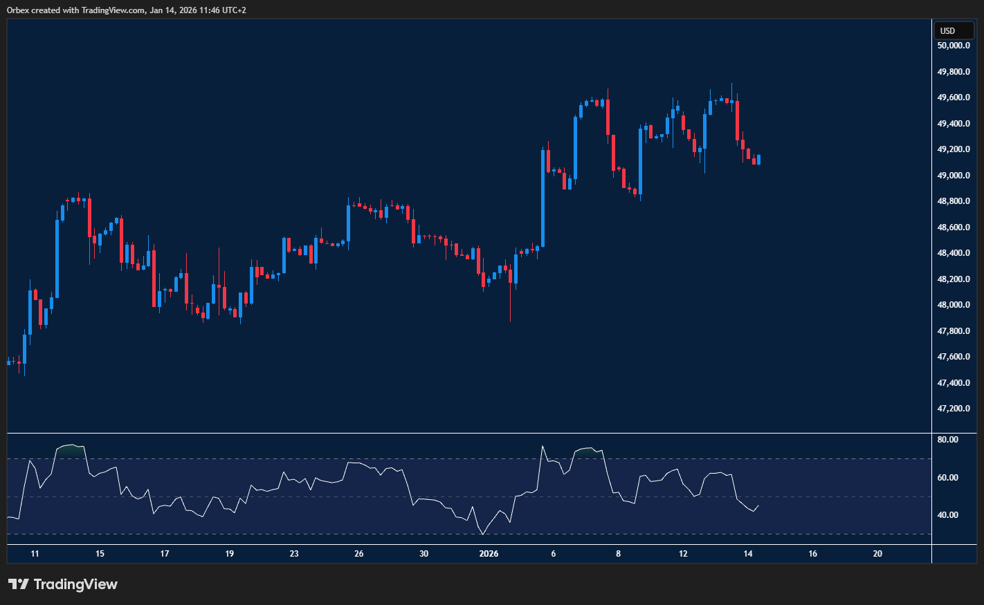 The Dow looks to bounce back after moving away from the recent double top. The index is attempting to head back towards 49600, but the psychological level of 49000 is proving a difficult hurdle to overcome. Zooming into the intraday chart, a bullish RSI divergence suggests another turn higher, but a fall below 49000 would confirm weakness and could create a double bottom at 48200.