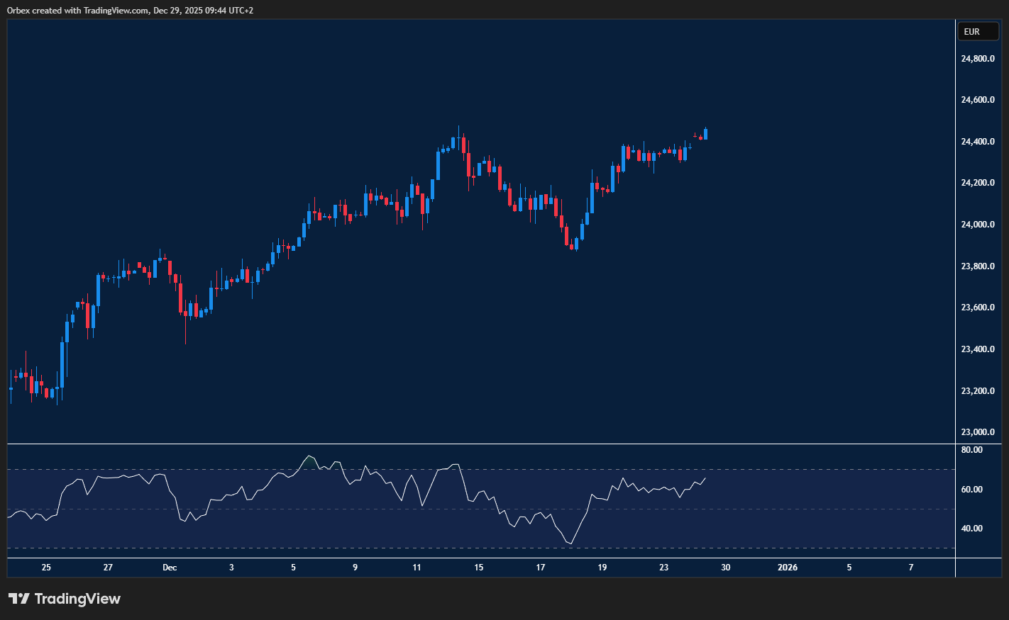 The GER 40 (DAX) remains consolidated after hitting another fresh peak. The recent bull run has sent the index above the 24400 level. A breakout could clear the path for a rise to another all-time high and reinforce the expectation of a bullish continuation. In the near term, however, the RSI’s repeatedly overbought stance could prompt buyers to take some profits off the table, and 24000 would be a critical support in the event of a retracement.