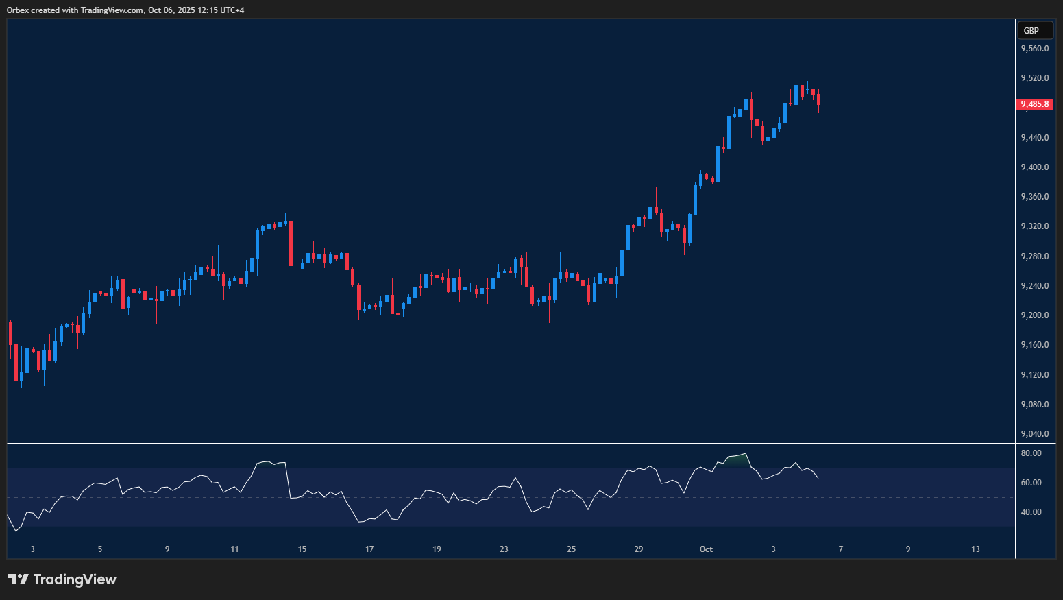 The FTSE continues to climb, and the index has so far found support at 9440 as price action creates a bullish channel, offering buyers some relief. Still, they are not out of the woods yet, as the latest bounce could be due to short-term sellers’ profit-taking, with some support from bargain hunting. 9550 is the next test higher, and a bullish breakout could extend the rally. However, a fall below 9400 could cause a reversal towards 9180 at the base of the latest move.