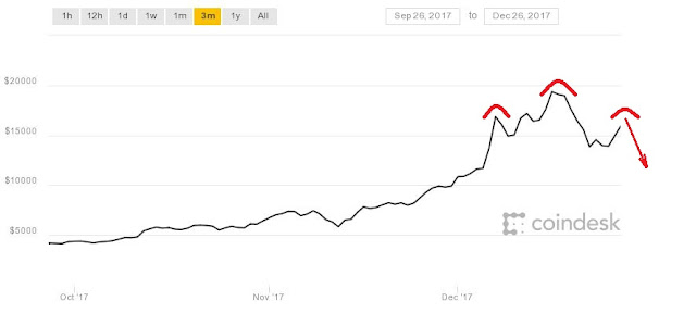The price action seems like it's stalling around the shoulder area of $15000 to $17000, which would complete the right shoulder of a major top. I like the blockchain enablers, the real ones, not just the jokers with no credible history of running a business who are slapping on a "blockchain" hat to jump their stock. But I am going to wait until Bitcoin works its way out of this sticky wicket one way or the other before dabbling with blockchain anymore. The good stocks here may be a lot like the good networking stocks of 1995.