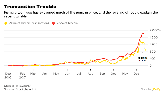 Bitcoin itself appears to me to be at a precarious technical juncture. I say "technical" because there appears to be no way to value Bitcoin fundamentally. About the closest thing to such a valuation I've seen is given by an article from The Economic Times titled "Bitcoin: This One Factor Could Tell How Far Bitcoin Will Plunge". The idea is to value the Bitcoin price by the value of bitcoin transactions - by how much it is actually used as a medium of exchange. As the following graph from the article shows, this value gauge has grown in close proximity to the price, up until about a month ago.
