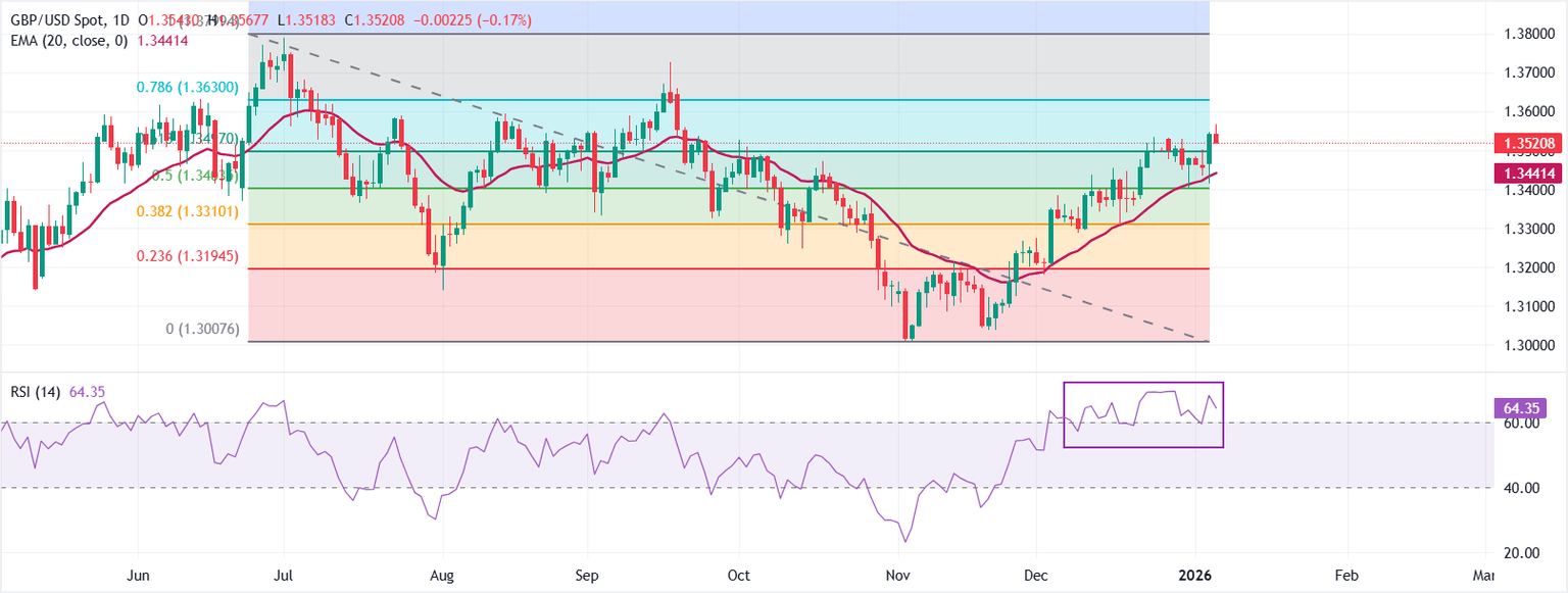 GBP/USD trades lower to near 1.3520 at the time of writing. However, the outlook of the price is bullish as the 20-day Exponential Moving Average (EMA) is rising, keeping the short-term bias pointed higher. A sustained close above this gauge favors follow-through on the advance.