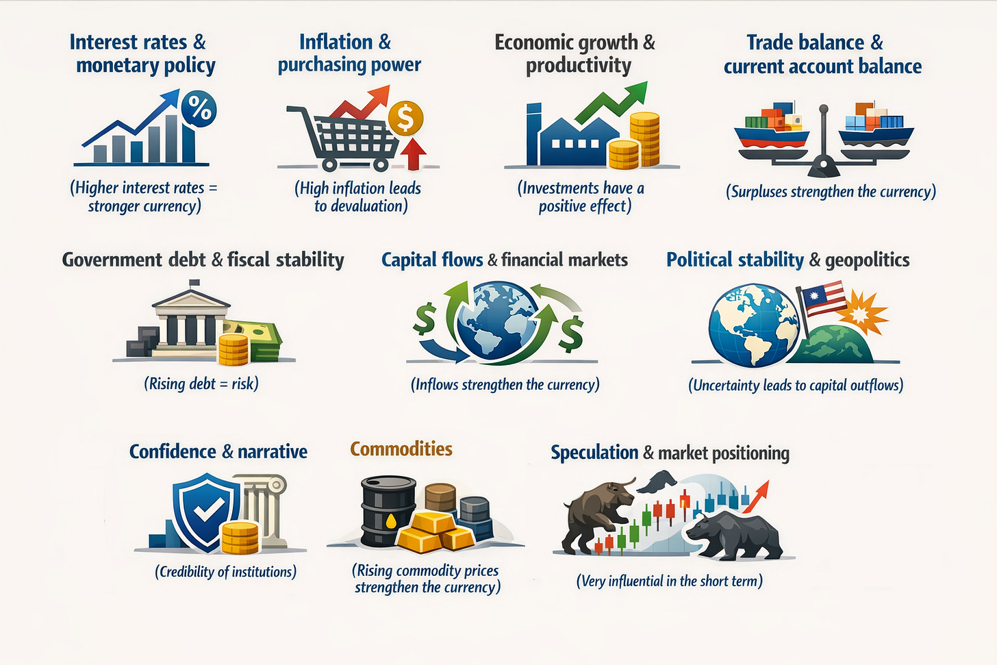 We asked ChatGPT what variables influence a currency. The answer was as detailed as it was interesting. Basically, ten key factors can be identified:
