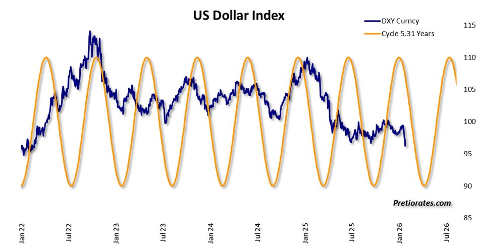 A shorter time horizon of around 5.31 years reveals another cycle – not perfect, but certainly noteworthy. It is still having a negative impact, but this cycle will also turn in the second quarter of 2026 and become a supporting factor for the US Dollar.