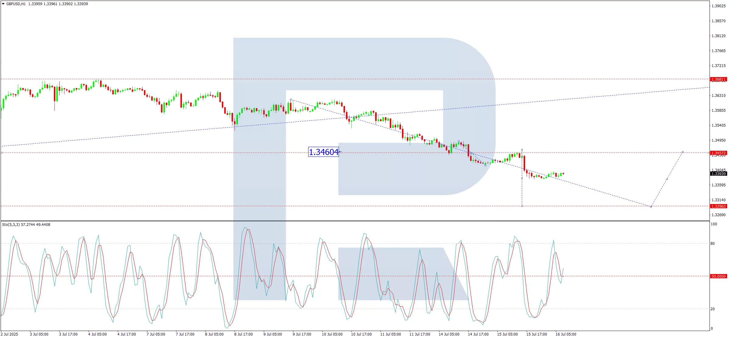 On the H1 chart, the GBP/USD pair is extending the third wave of its decline, with a local target at 1.3296. Once this level is reached, a correction towards 1.3460 could unfold. Technically, this scenario is supported by the Stochastic oscillator, with its signal line below 80 and trending sharply downwards towards 20.