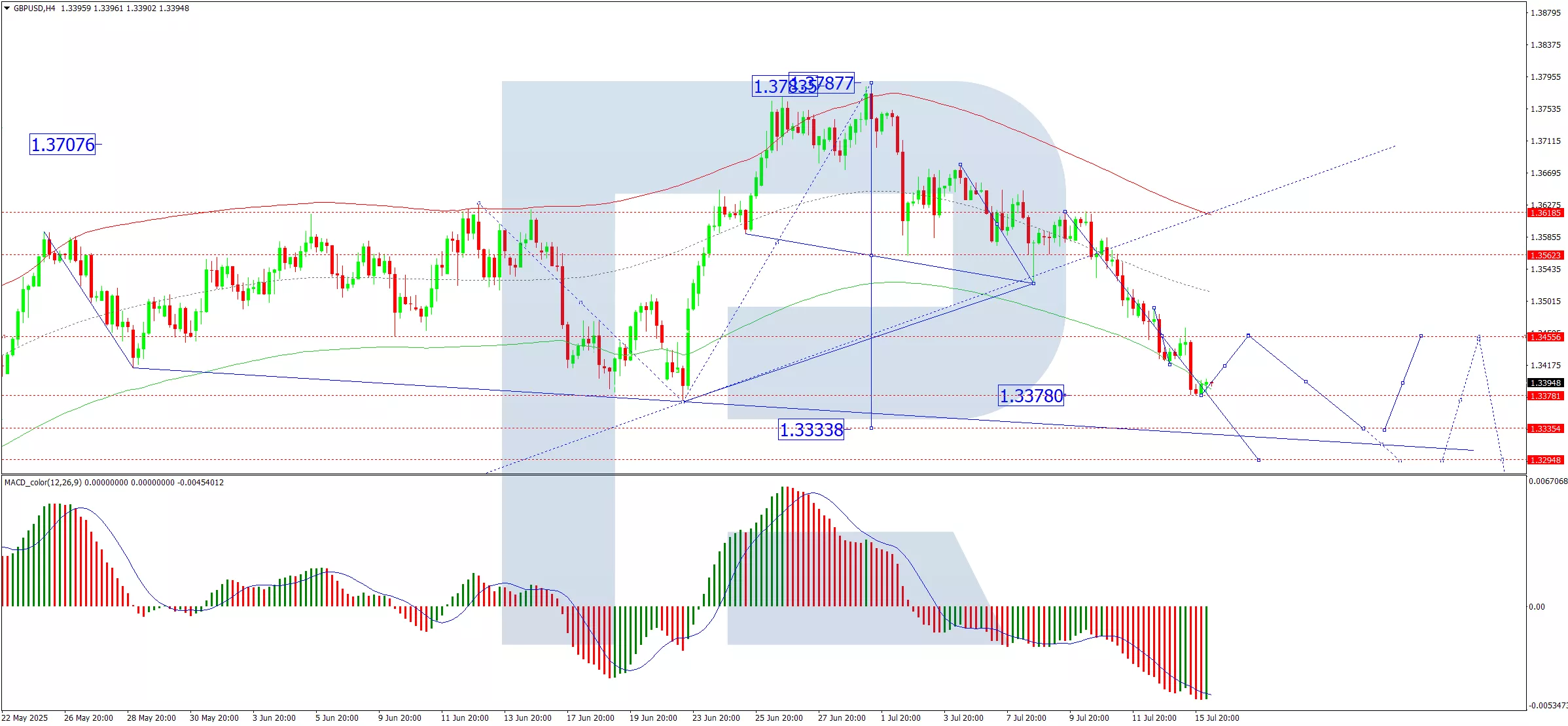 On the H4 chart, the GBP/USD pair has declined to the 1.3450 level, where a consolidation range has now formed. The pair has broken out to the downside, reaching 1.3378. Today, a short-term rebound to 1.3415 (as a retest from below) is possible. However, if resistance holds, the pair may resume its decline towards 1.3296. Upon completion of this downward wave, a potential bounce towards 1.3450 could follow. Technically, this scenario is confirmed by the MACD indicator, whose signal line is below zero and pointing firmly downward.