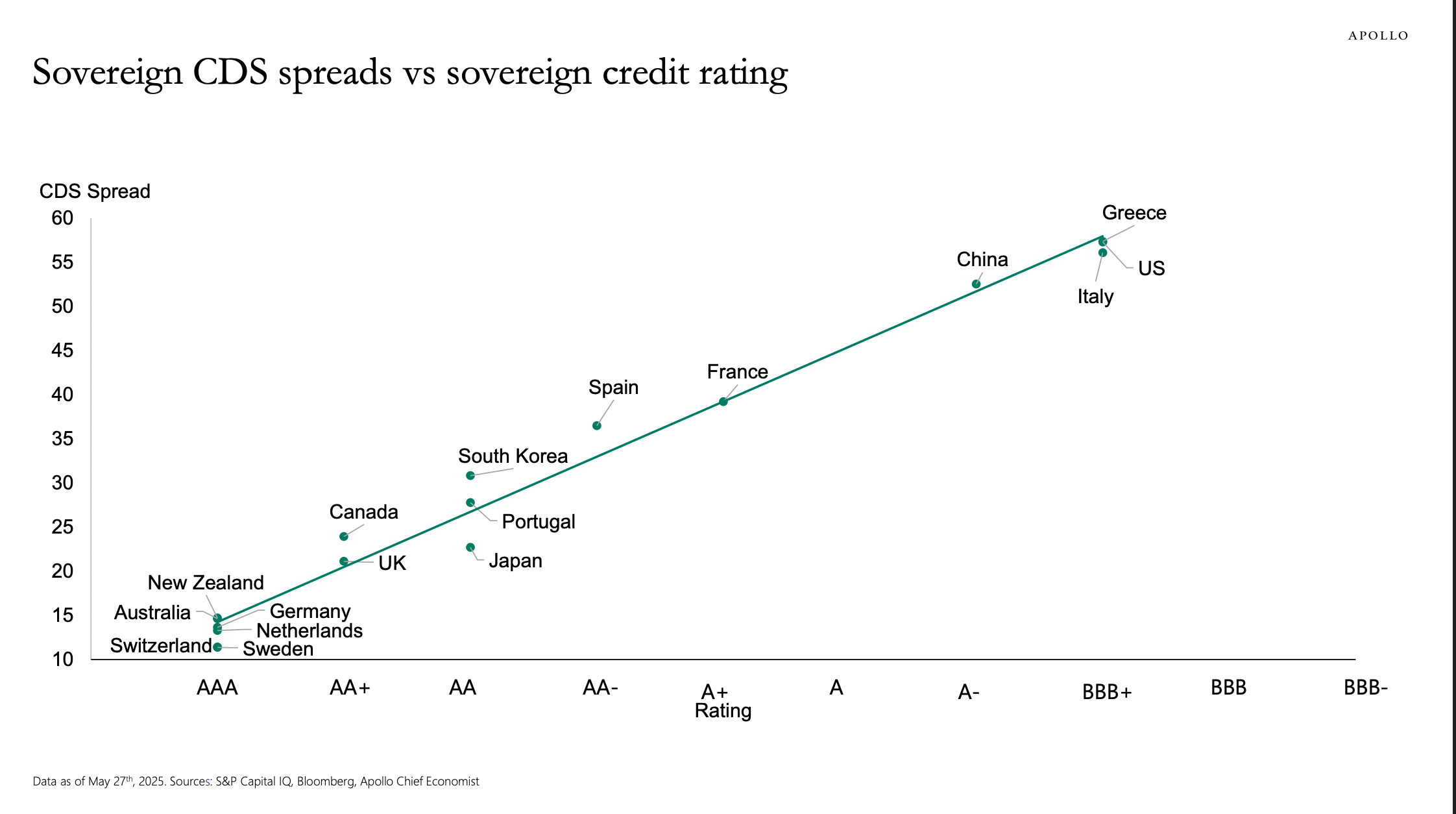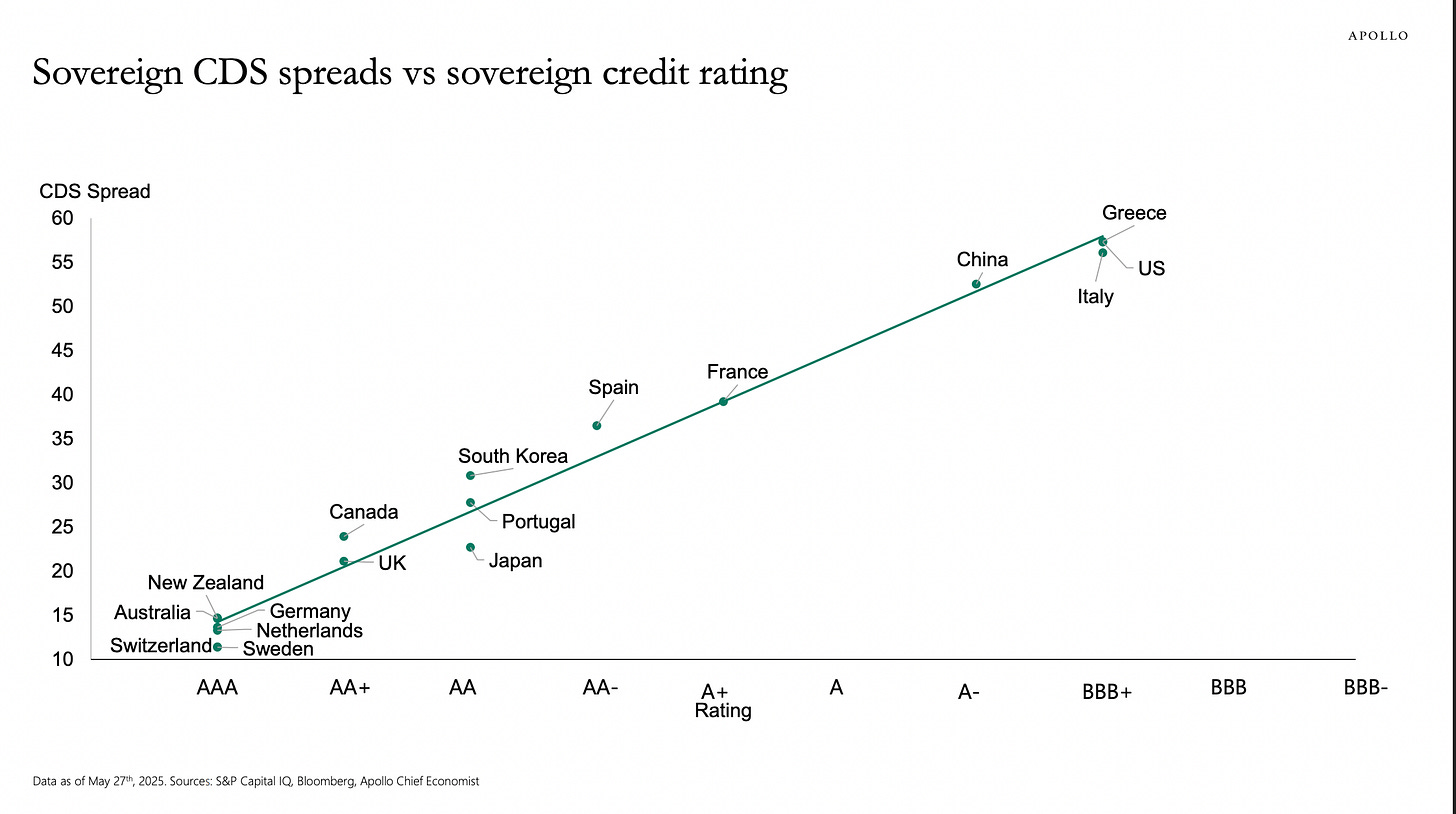 The U.S. sovereign CDS spread is flashing yellow. It’s now trading at levels typically reserved for BBB+ credits—think Italy, think Greece. In other words, the market is quietly pricing America’s credit risk more like a structurally fragile European sovereign than the issuer of the world’s reserve currency.