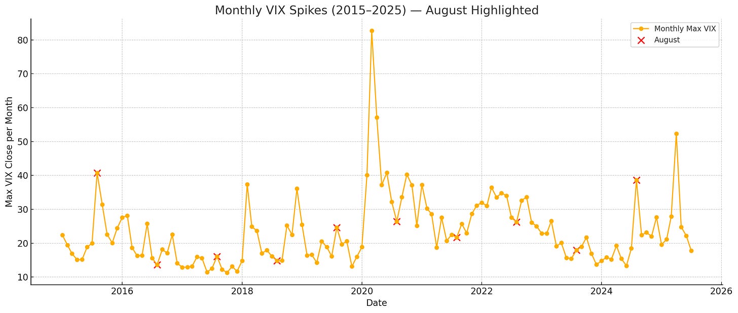 Volatility can spike in August, not because the world is falling apart, but because markets are less able to handle normal flows. The VIX jumping above 20 this week is a case in point. When liquidity is thin, even routine rebalancing or macro hedges can look like directional conviction, leading to exaggerated moves.