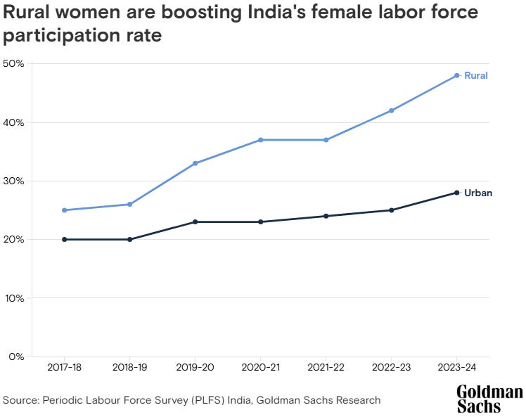 But unlocking the full upside hinges on a critical piece still missing from the engine: female participation. As Goldman’s Chaitra Purushotham points out, even a return to previous peak labor force participation could tack on a full percentage point to India’s potential growth. In a world starved for productivity, that’s not just a marginal gain—it’s a macro game-changer. The 20-year window is open, but it won’t stay that way forever. Now comes the hard part: policy, inclusion, and clearing the runway for half the population to get to work.