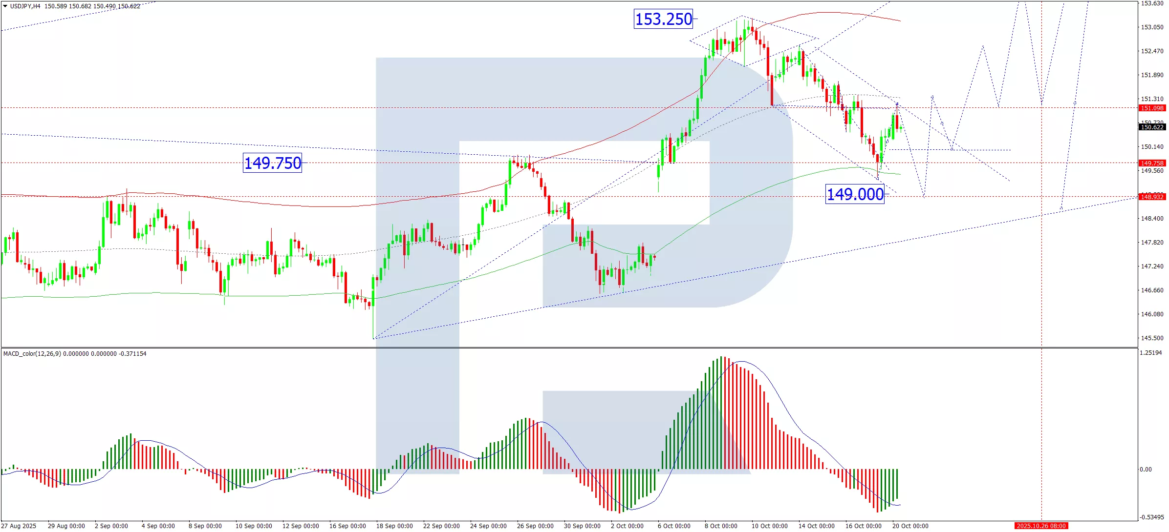 On the H4 chart, the USD/JPY pair formed a consolidation range around 151.10. Following a downward breakout, the pair successfully reached its initial target at 149.38. The market has since completed a technical retest of the 151.10 level from below. The immediate scenario favours a further correction towards 149.00. Following this decline, we anticipate the start of a new growth wave, with initial targets at 151.50 and a longer-term prospect of resuming the broader uptrend towards 154.10. This outlook is technically confirmed by the MACD indicator. Its signal line remains below zero and is pointing downward, reflecting sustained bearish momentum with potential for a subsequent reversal.