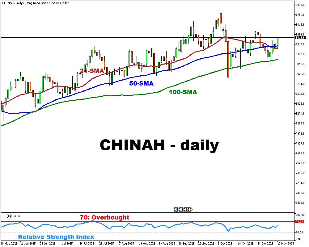 Industrial output is seen slowing to 5.8% y/y (from 6.5 %), while retail sales are forecast at 2.2% y/y (previous 3%). Stronger-than-expected prints would boost market confidence in China’s recovery and likely lift the CHINAH index; weaker numbers could dampen risk appetite.