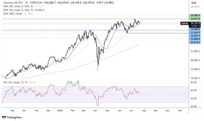 The DAX extended its recovery from the 23k low, running into resistance at 24,636, a record high, before easing back. The price continues to trade above the rising trendline and the 50 SMA at 24,000; however, momentum is slowing.