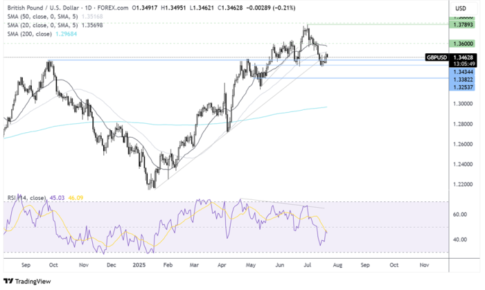 GBP/USD is consolidating around 1.3470 after gains of 0.5% in the previous session. Risk sentiment is slightly weaker amid uncertainty over Trump’s trade tariffs, supporting demand for the safe-haven USD.