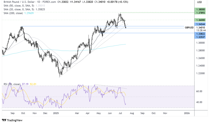 GBP/USD has found support at 1.3375, having fallen from its 3.5-year high of 1.3790 and taken out several key support levels that had previously turned into resistance at 1.36, 1.35, and 1.3435, the September 2024 high, as well as rising trendline support.