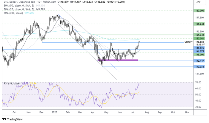 Meanwhile, the yen has weakened despite an improvement in sentiment among Japanese manufacturers in July, thanks to a rebound in the semiconductor sector. However, concerns persist more broadly over the potential impact of U.S. trade tariffs. Trump has threatened a 30% trade tariff on Japan if a deal is not made before the August 1st deadline.