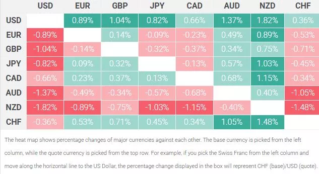 The table below shows the percentage change of the Swiss Franc (CHF) against the listed major currencies this week. The Swiss Franc was the strongest against the New Zealand Dollar.