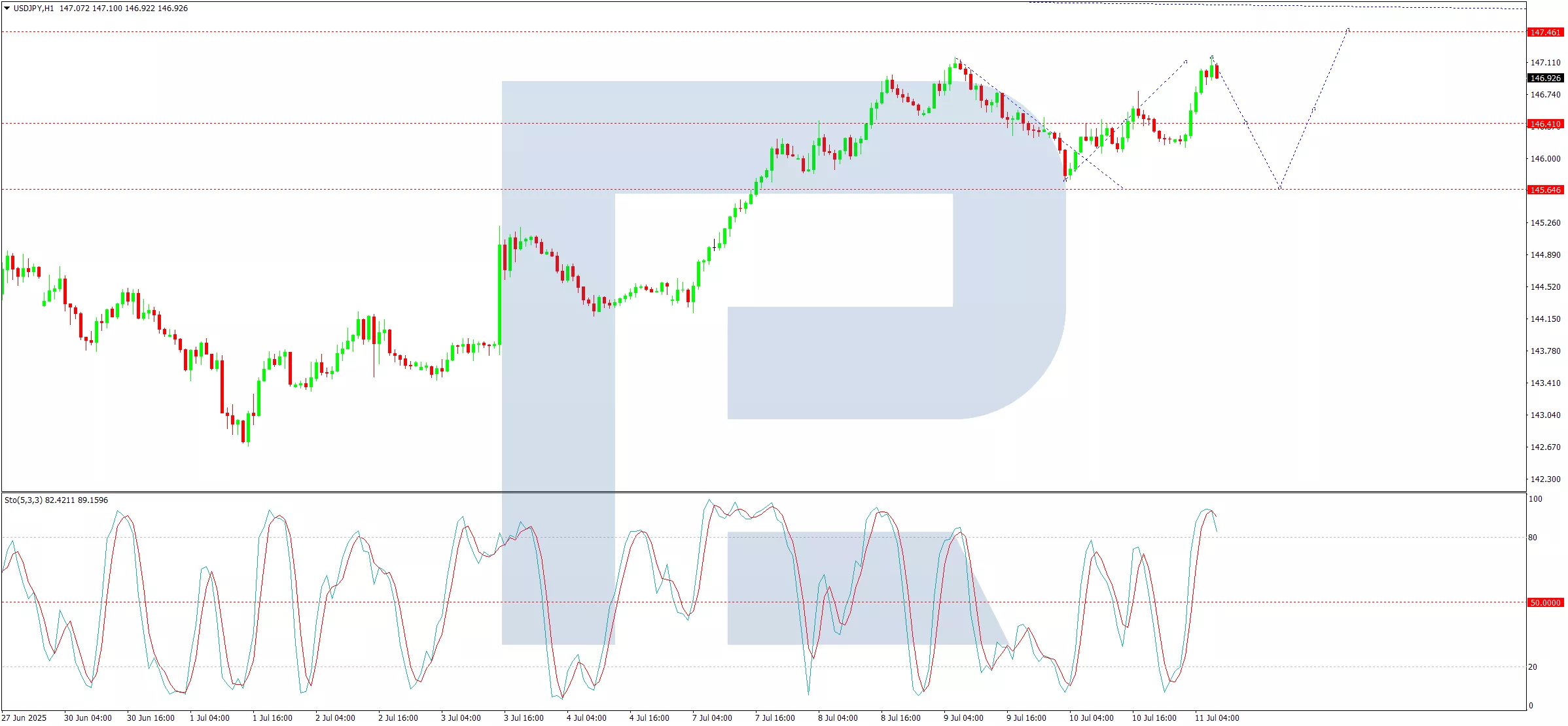 A consolidation phase near 146.41 preceded an upward breakout, completing a wave structure at 147.17. A downward correction towards 145.65 is now in view, corroborated by the Stochastic oscillator, where the signal line sits at 80 and points sharply downward.