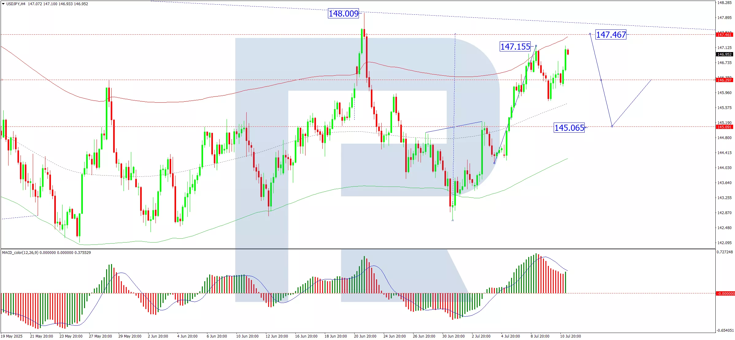 The USD/JPY has established a consolidation range around 145.65, now extending to 147.17. A short-term pullback to 145.65 (testing from above) is anticipated, followed by a potential upward wave targeting 147.47 at minimum. This outlook is supported by the MACD indicator, with its signal line firmly above zero and trending upward.