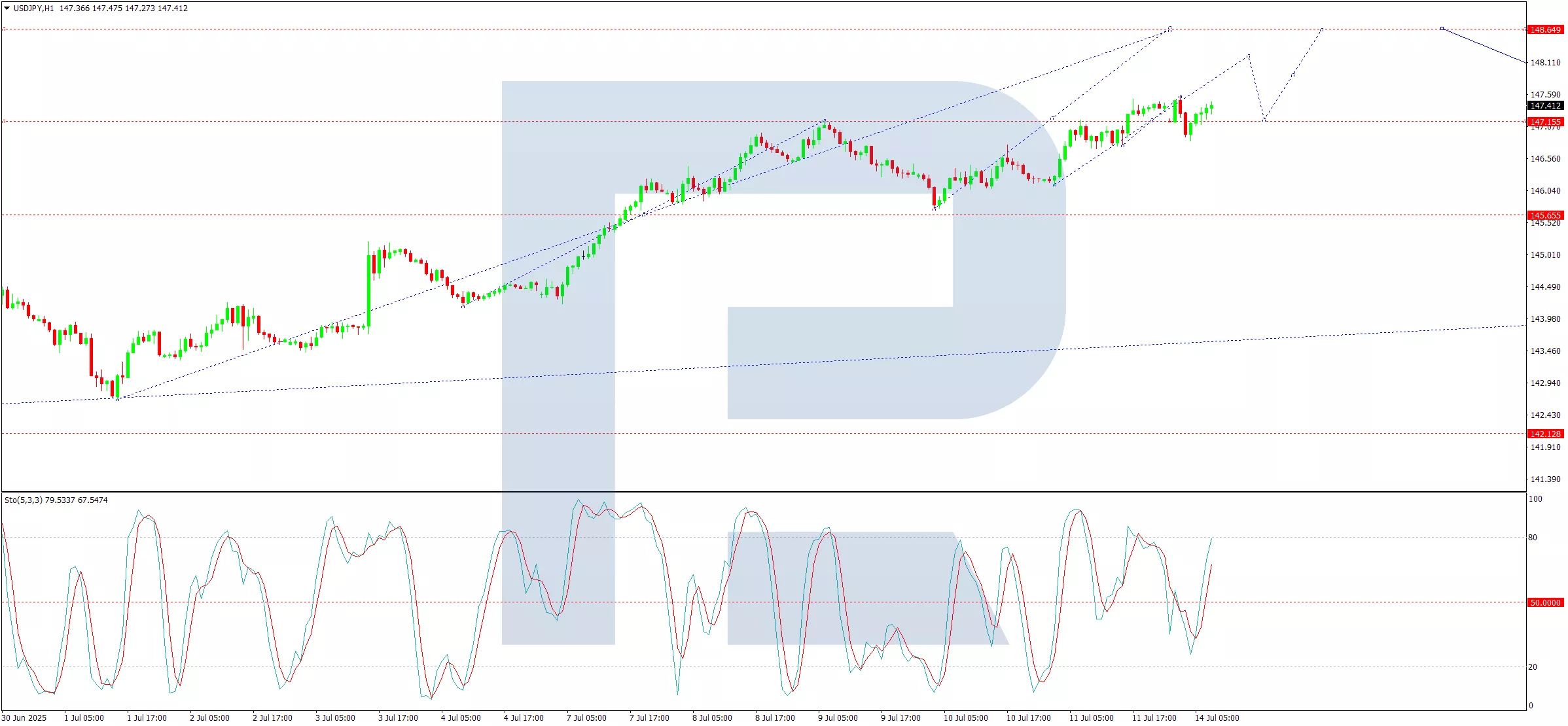 The H1 chart shows the pair consolidating around 147.17, with the current structure suggesting further upside towards 148.65. Today, we anticipate an initial push to 148.18, followed by a retracement to 147.17, before another rise towards 148.65. The Stochastic oscillator corroborates this outlook, with its signal line positioned at 50 and trending upward.