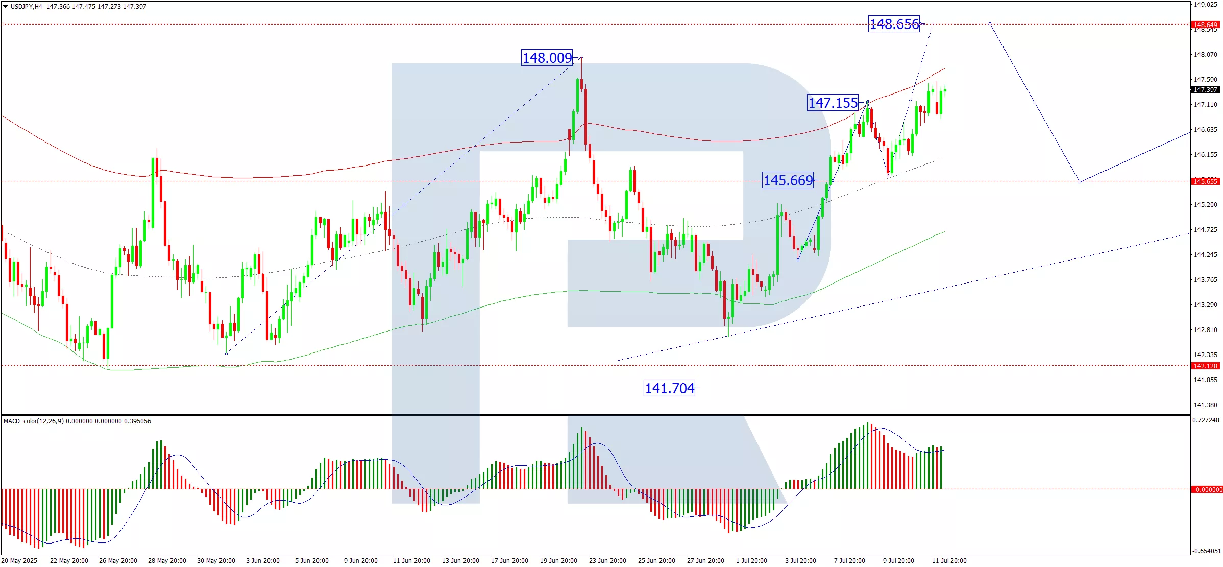 On the H4 chart, USD/JPY continues to advance within the third wave of its corrective movement towards 148.65. Today, we expect the pair to test this level before a potential pullback to 145.65 (testing from above). Subsequently, another upward wave could materialise, targeting at least 150.66. This scenario is supported by the MACD indicator, where the signal line remains above zero and points firmly upward.