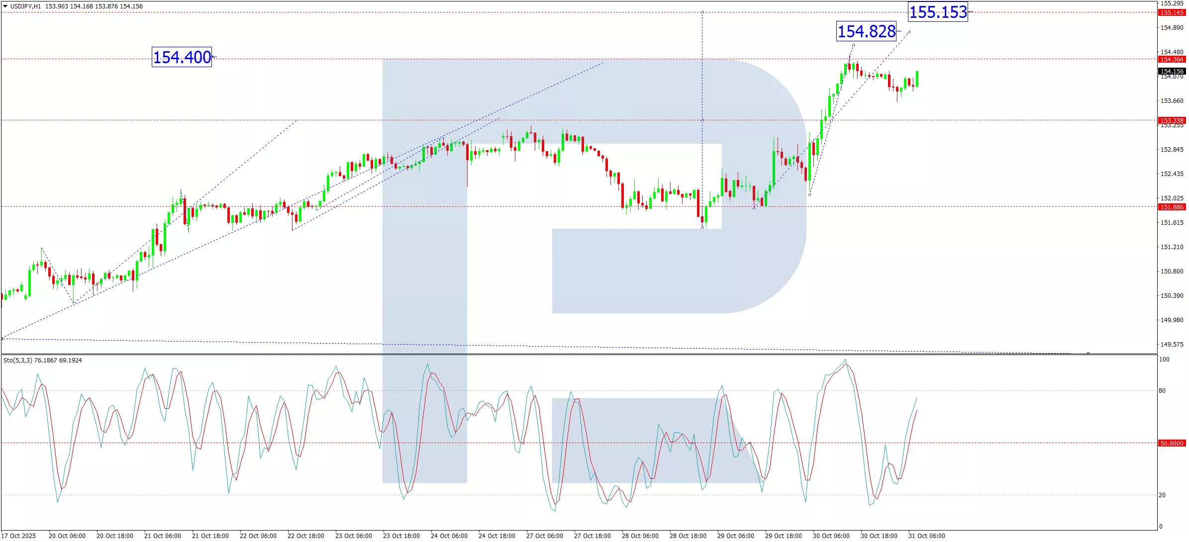 On the H4 chart, USD/JPY has completed a bullish wave structure, reaching 154.40. The pair is now likely to enter a period of consolidation at these highs. A decisive downward breakout from this range would signal the start of a correction, with an initial target at 151.88. Conversely, an upward breakout would open the path for the next leg of the rally towards 155.70.