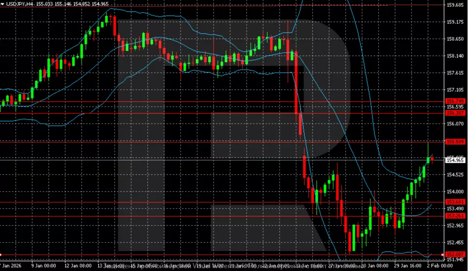 The H1 chart shows that after a sharp decline, the pair entered a recovery phase and has been sequentially updating local maxima. The price climbed above the 153.26–153.88 zone and is trading along the upper end of the Bollinger Bands, indicating continued near-term momentum. A slowdown is observed near the 155.50–155.60 level, with a possible pause or pullback within the ongoing correction.