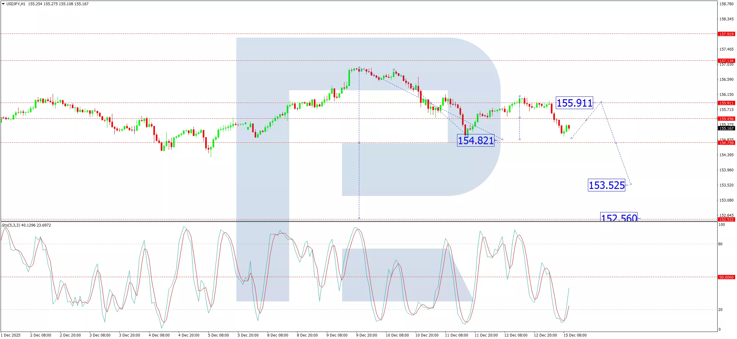 On the H1 chart, the pair is forming a declining wave with an immediate target at 154.82. Upon reaching this level, a corrective upward move towards 155.45 is anticipated. A further extension of this correction to 155.91 cannot be ruled out. However, following this relief rally, we expect the primary downtrend to resume, driving the pair lower towards 153.52. The Stochastic Oscillator aligns with this near-term corrective view, as its signal line has turned up from the 20 level and is rising towards 50, suggesting a temporary bounce is likely before selling pressure reasserts itself.