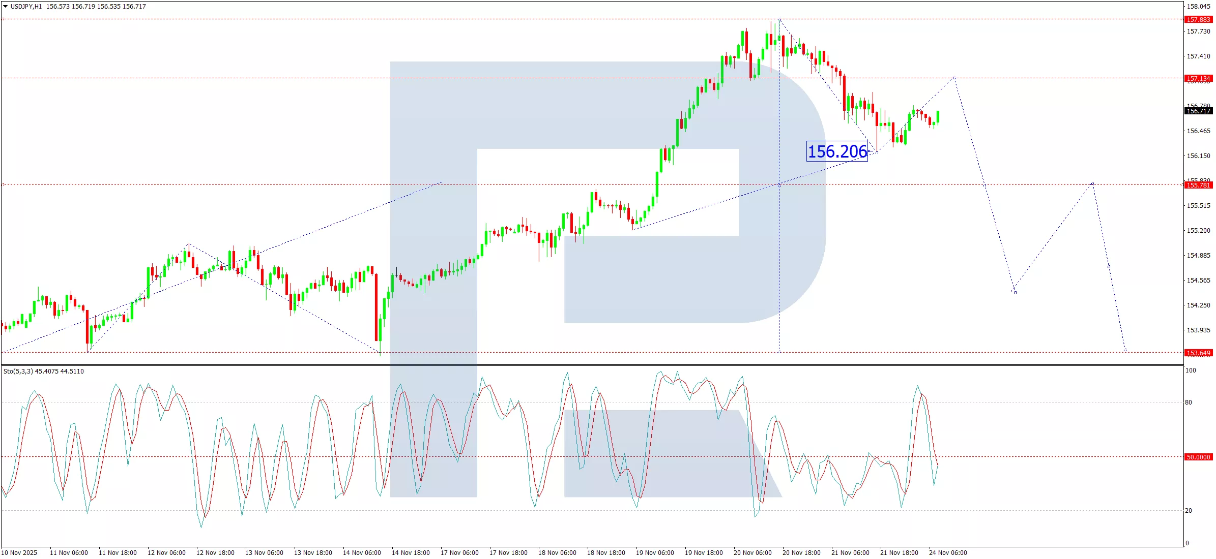 On the H1 chart, the pair completed a downward wave to 156.20. We are now observing a corrective phase for this move, with an initial target set at 157.13. Upon completion of this upward correction, we expect the next leg of the downtrend to develop, targeting 154.44. The Stochastic oscillator confirms this near-term view. Its signal line is above 50 and rising towards 80, indicating that short-term buying pressure is driving the correction before the larger bearish trend reasserts itself.