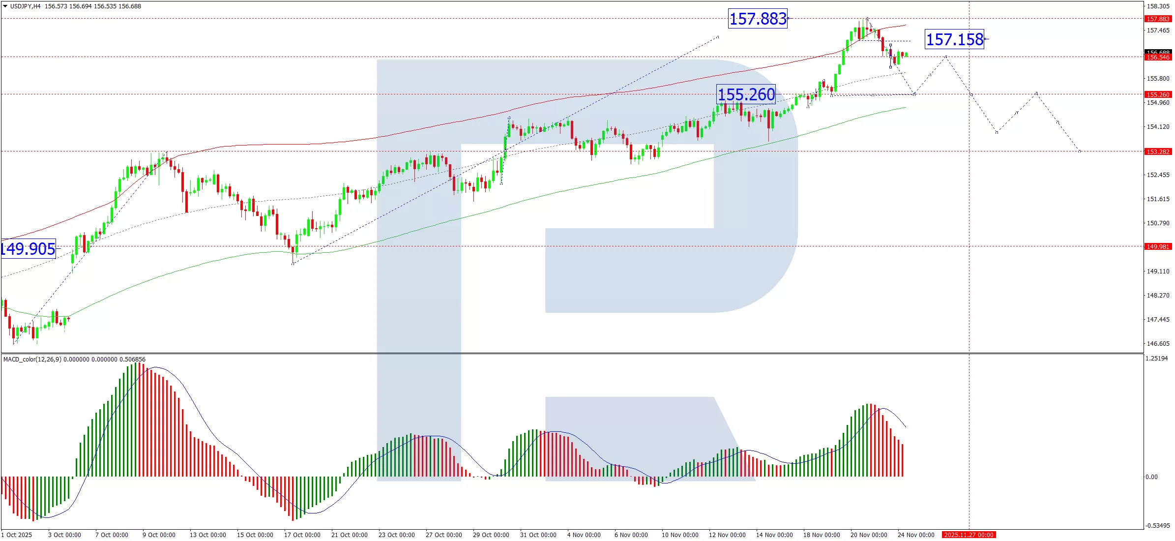 On the H4 chart, USD/JPY completed its first downward impulse to 156.19 and is now forming a consolidation range around 156.55. An upward breakout from this range is expected to trigger a corrective rally towards 157.15. Following this correction, we anticipate the resumption of the bearish move, initiating a new downward impulse with an initial target at 154.00. A break below this level would open the path for a deeper correction towards 153.30. This scenario is technically supported by the MACD indicator. Its signal line is above zero but is pointing decisively downward, suggesting that while the pair is correcting from overbought conditions, the underlying momentum is shifting bearish.