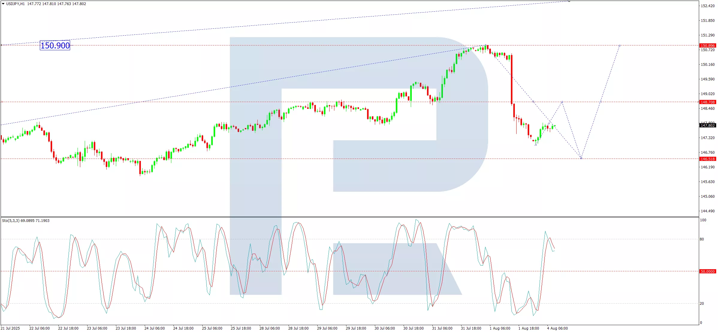 On the H1 chart, USD/JPY is forming a corrective structure towards 146.52. A temporary rebound to 148.70 (testing from below) is expected today, followed by a possible resumption of the correction to 146.52. Once this correction concludes, a fresh upward wave towards 151.00 could materialise. The Stochastic oscillator validates this outlook, with its signal line positioned above 50 and pointing upwards.