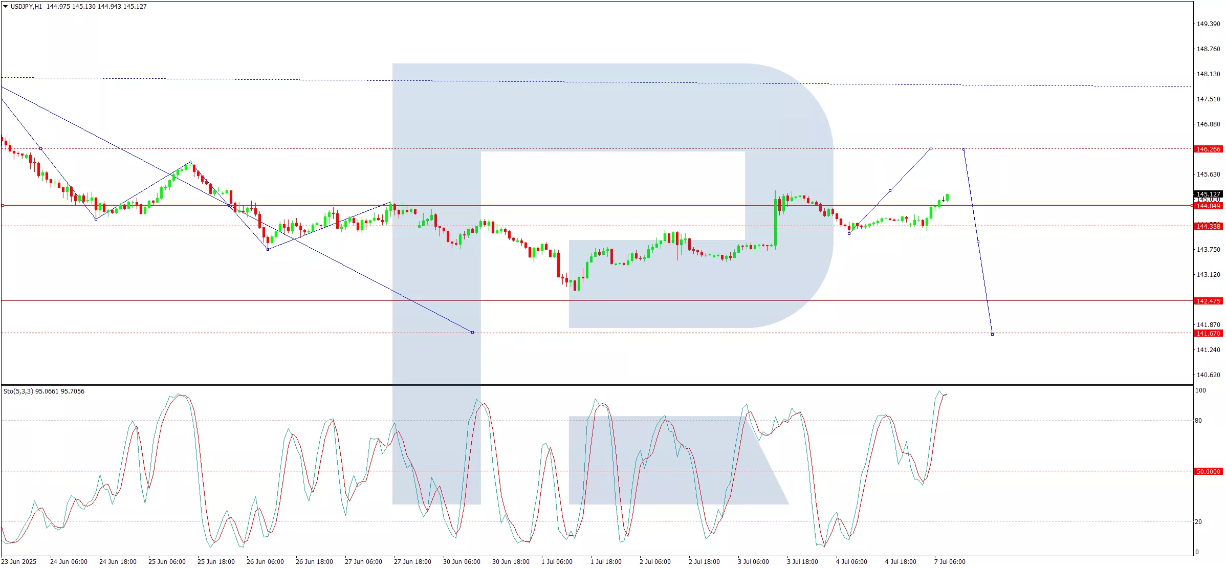 On the H1 chart, the pair corrected to 144.11 before resuming its upward trajectory, targeting 146.26. Upon reaching this level, we expect a new decline towards 143.90. A break below this level could extend losses to 141.70. The Stochastic oscillator aligns with this view, with its signal line currently at 80 and turning downward.