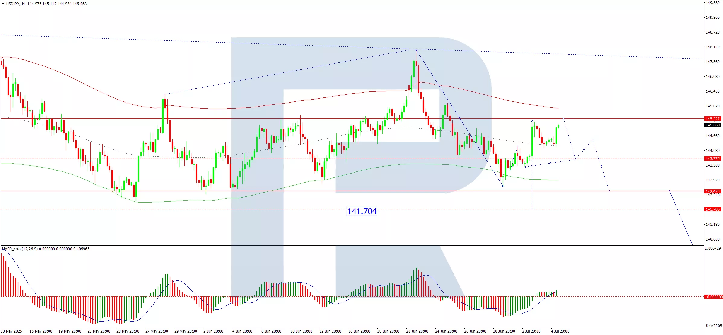 On the H4 chart, USD/JPY has formed a consolidation range around 144.33 before pushing upward. The immediate target is 145.33, after which we anticipate a downward correction towards 142.45, with potential for further declines to 141.70. This scenario is supported by the MACD indicator, where the signal line remains above zero and points firmly upward.