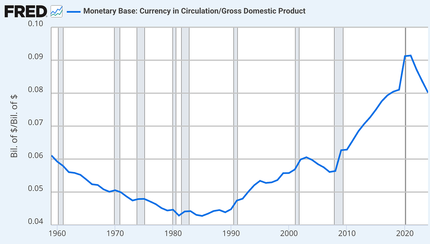 That seems like a plausible argument, but I’d need more information before forming an opinion. Consider that in recent decades there has been a dramatic decline in the use of currency in transactions. I hardly ever pay for goods in cash, and I don’t believe I’m atypical. And yet total currency demand has increased sharply since the 1980s, from just over 4 percent of GDP to roughly 8 percent.