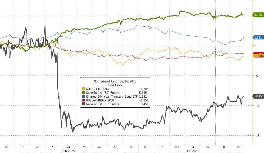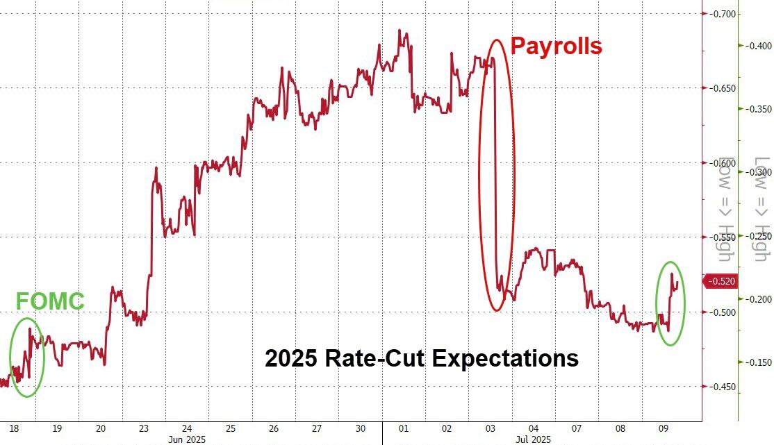 Since the last FOMC meeting (June 18th), which saw a hawkish tilt to the dots (with Fed members notably divided - nearly as many participants anticipated no rate cuts this year as expected two), we have seen stronger-than-expected jobs data, constant diatribes from the president that 'too late' Powell should be cutting rates, and some tariff developments that supported Powell's pause.